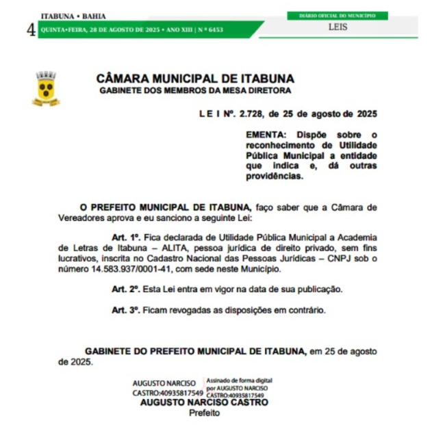 A Academia de Letras de Itabuna – ALITA comemora a importante conquista do reconhecimento de Utilidade Pública Municipal, conferido por meio da Lei nº 2.728, de 25 de agosto de 2025, sancionada pelo prefeito Augusto Castro e publicada no Diário Oficial do Município no dia 28 de agosto de 2025.